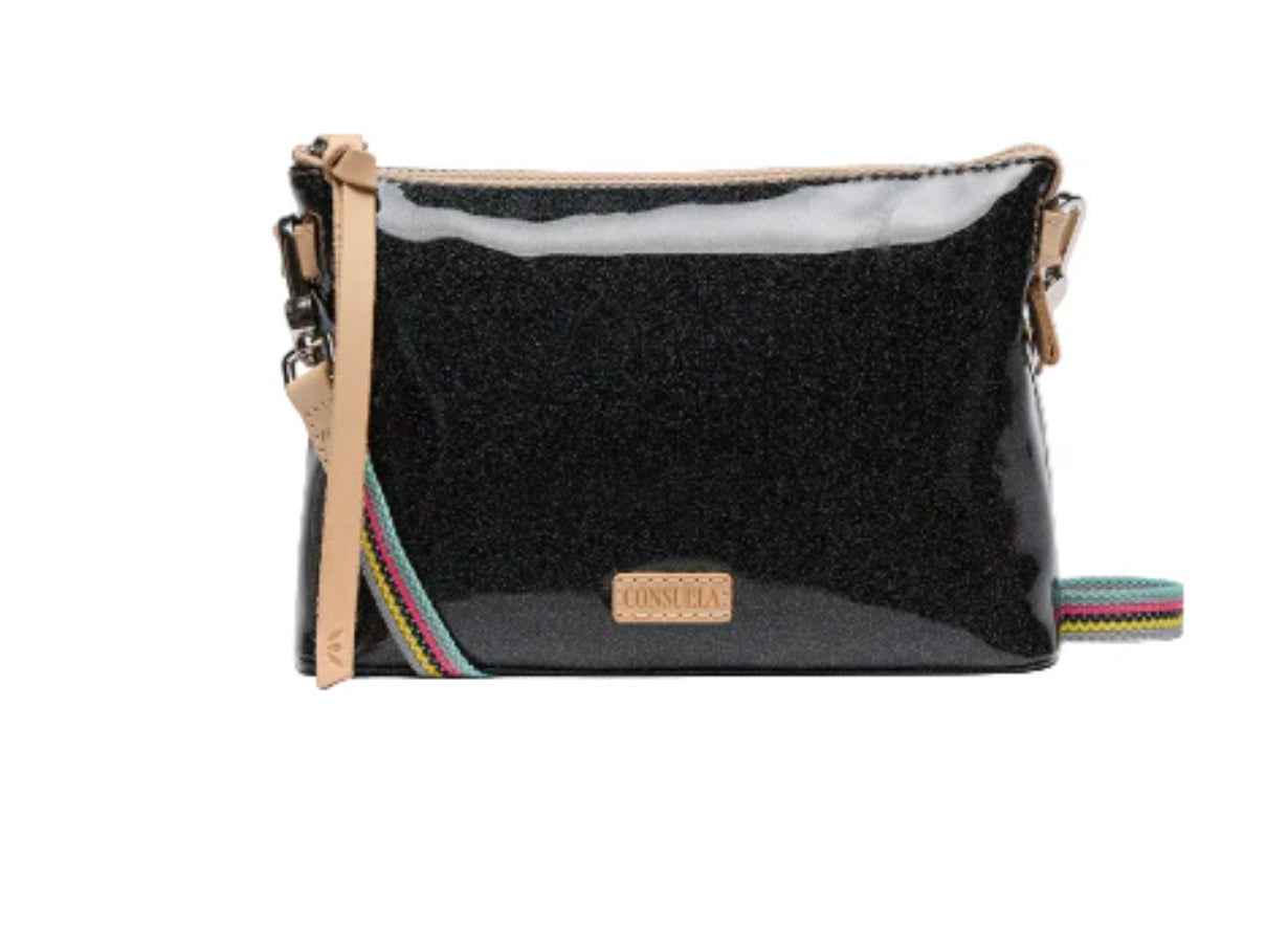 a specific black glitter crossbody bag from the brand Consuela. The bag is called the "Mariana" and is part of the "Midtown Crossbody" or "Downtown Crossbody" style. It features a zipper closure, a spacious interior with pockets, and an adjustable, woven strap.