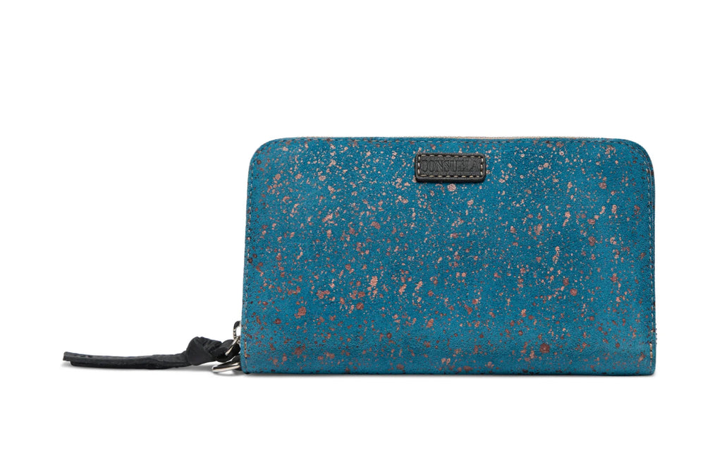 Function and versatility in the palm of your hand. Our new Essential Wallet is a streamlined, large capacity wallet with tons of room for cards, cash, and receipts — plus a zippered center compartment for coins and keepsakes. We added a D-ring so you can easily clip it to any Consuela wristlet strap or anchor onto an inside lanyard for added security.