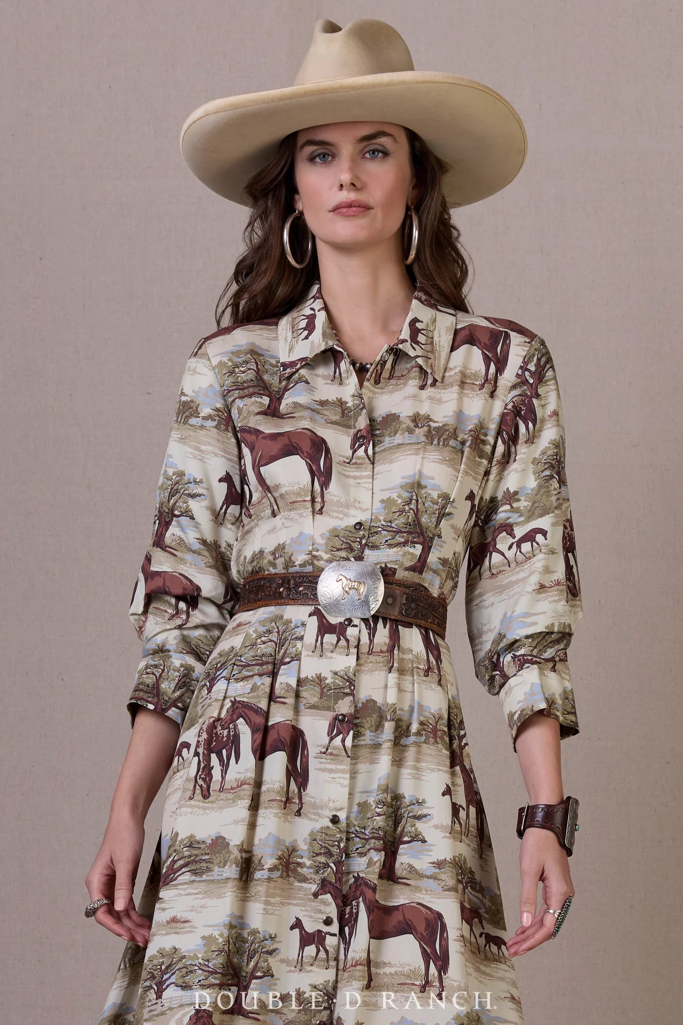 One of the strong influences – perhaps the original impetus – for this collection ties back to an old piece of textured trapunto artwork that used to hang in the McMullen family living room. It depicted a classic horse-in-pasture scene that always stuck with Cheryl and eventually inspired this season’s signature print, which perfectly aligns with the collection’s equine aesthetic. This classic collared dress boasts a chic, feminine silhouette with a fitted waist and well-placed pleats, wide-cuffed ¾ sleeves, and a full front placket of custom snaps.