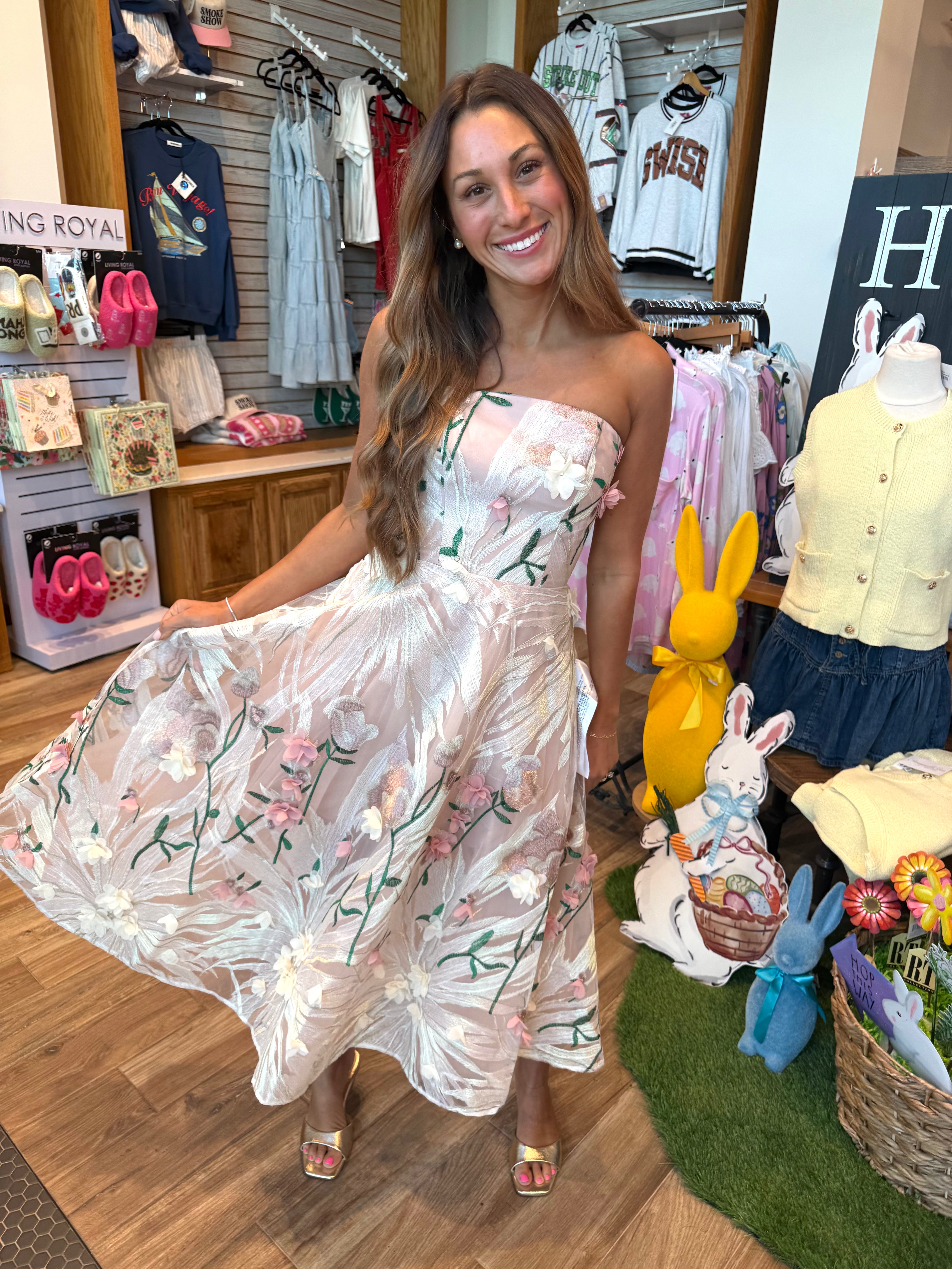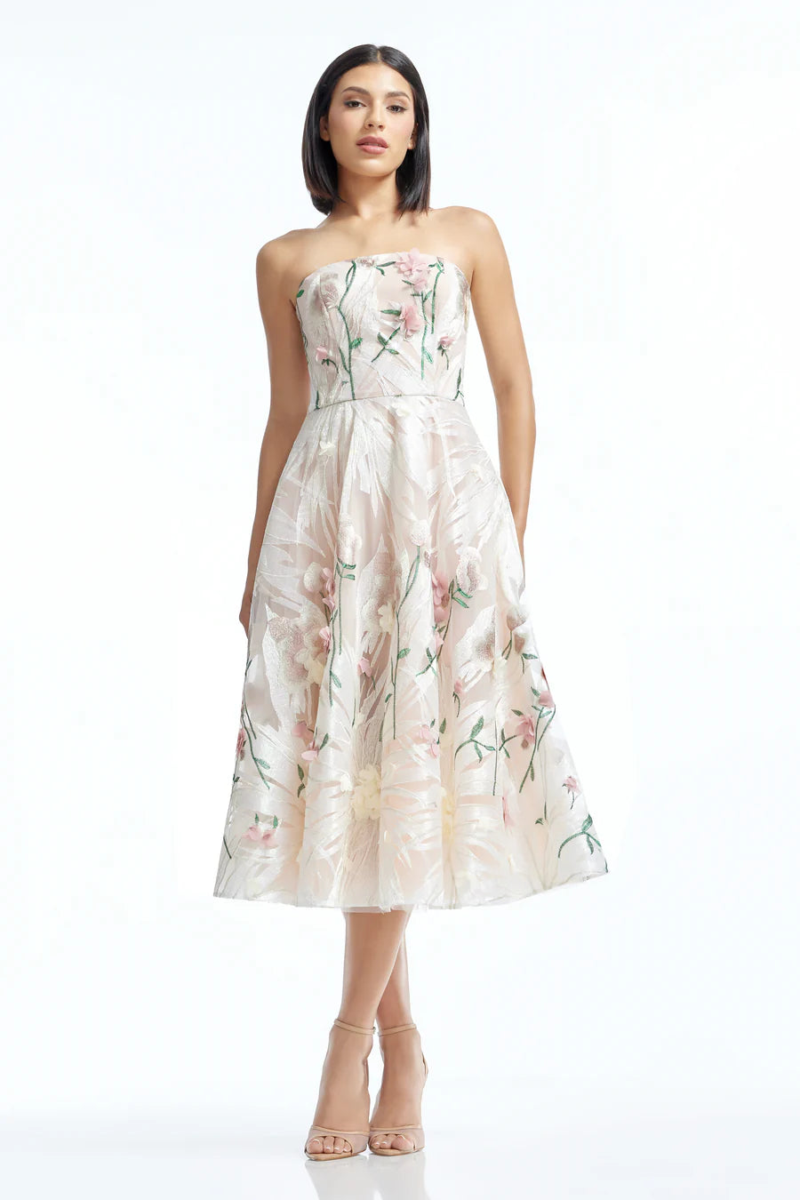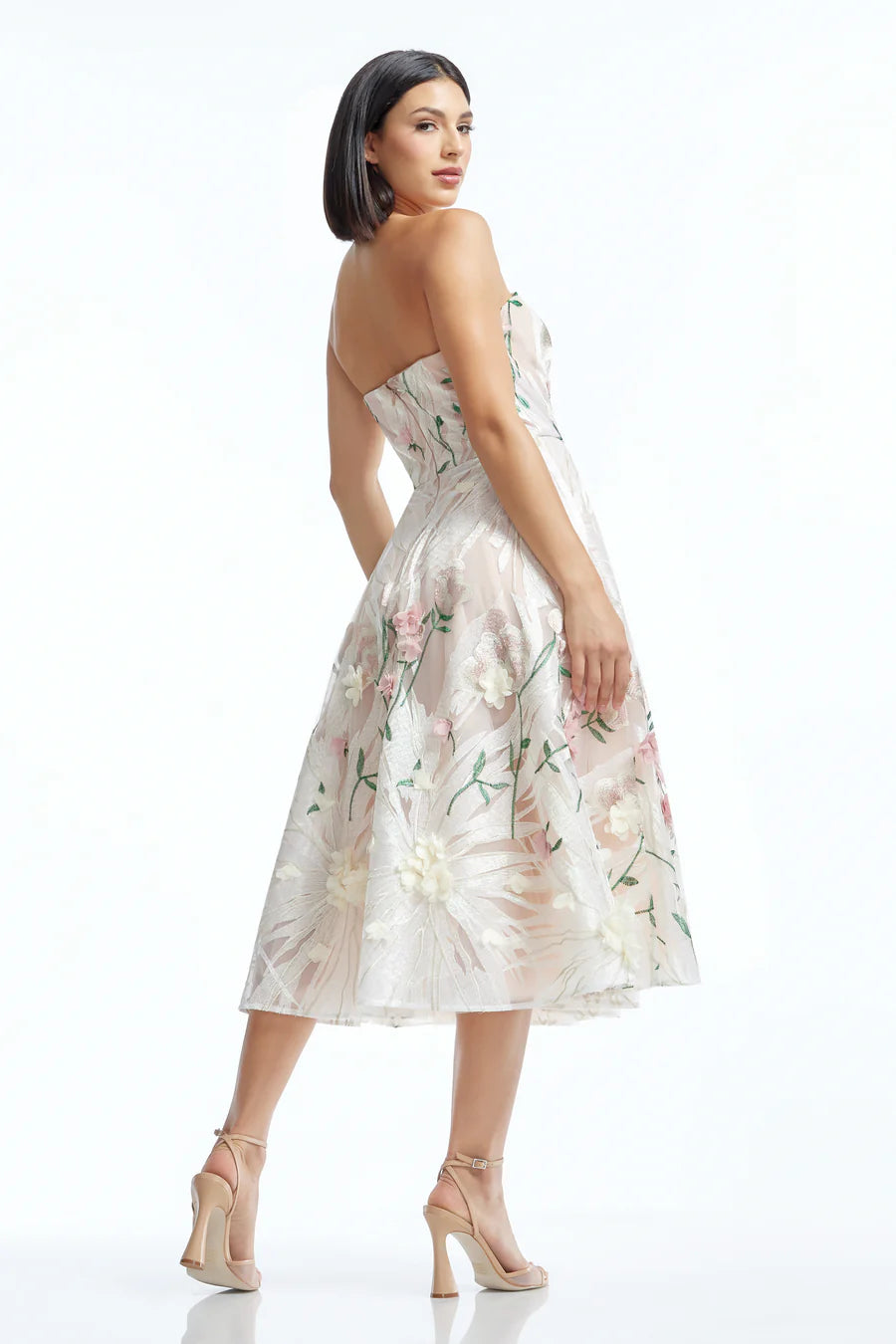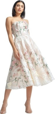 Make a statement with the Kailyn Dress. This strapless bustier fit and flare midi dress exudes elegance and sophistication. Crafted with attention to detail, this dress hugs your curves in all the right places and flares out beautifully, creating a timeless silhouette.