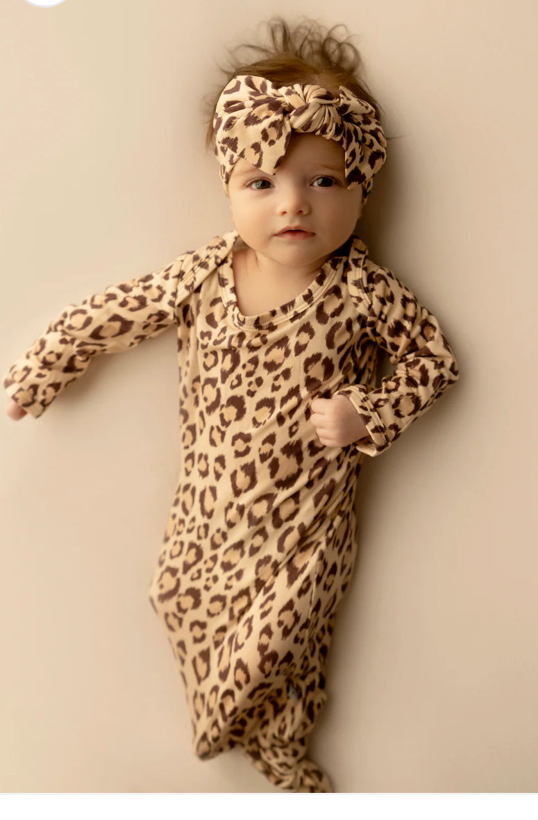 Knotted infant gown with foldable scratch mitts in 0-3 months.