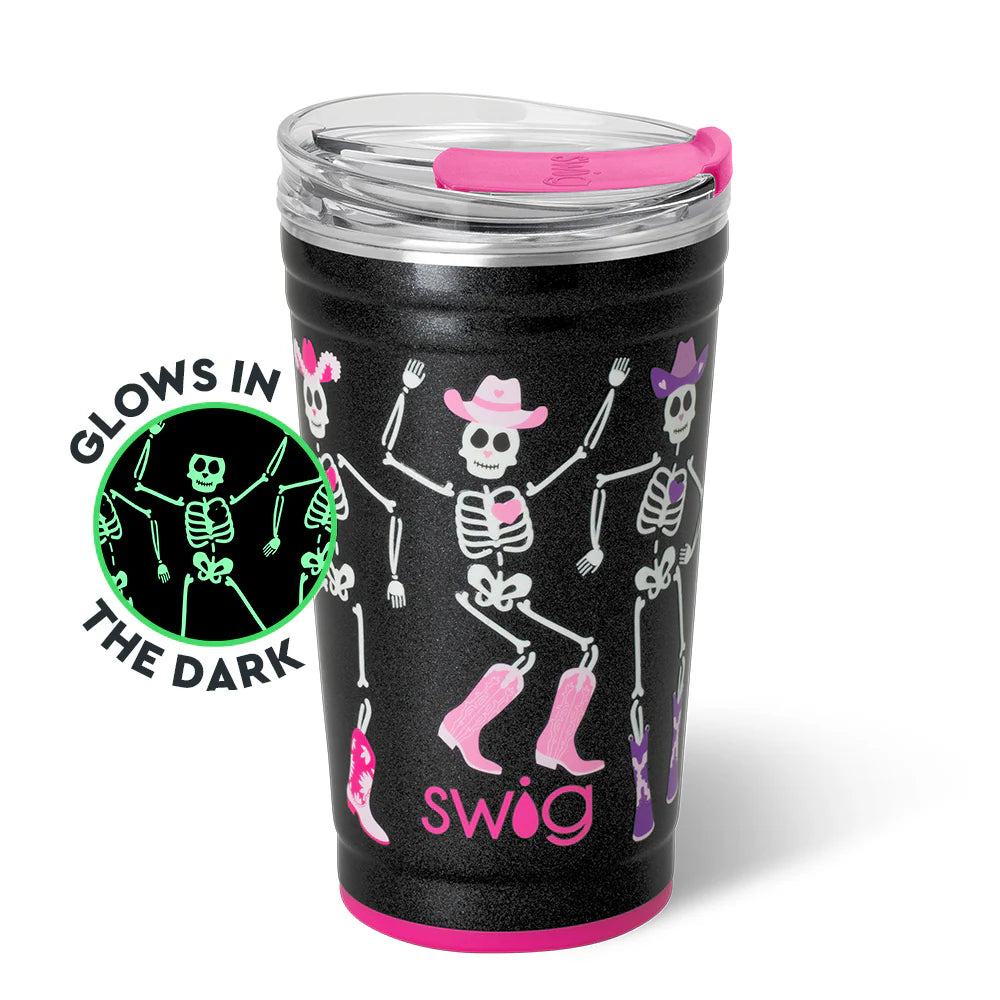 Party-Ready! 🥳🥤 Glitter glow in the dark skeletons boogie down at the rodeo with cowgirl boots and hats on a glitter black background.