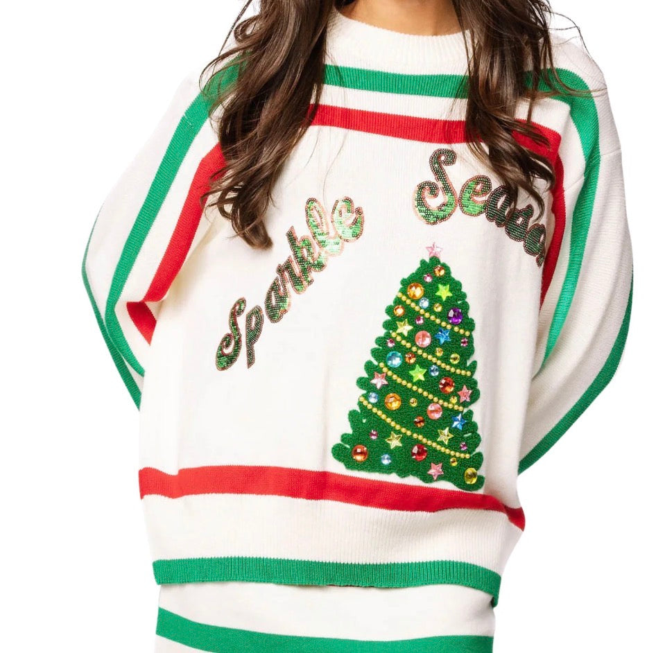Celebrate the festive spirit with this playful white sweater, adorned with cheerful green and red stripes and a sparkling Christmas tree graphic. The "sparkle season" text adds a fun holiday touch, making it perfect for cozy gatherings. Pair it with the matching skirt to complete your joyful, festive look.