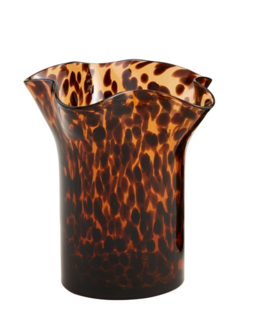 The Small Ruffle Glass Tortoise Vase is a charming and elegant decorative piece that adds a touch of sophistication to any space. Crafted from high-quality tortoise glass, this vase features a unique ruffle rim that enhances its visual appeal and adds a playful yet refined element to its design. Measuring 6 3/4 inches in height and 4 inches in diameter, it is the perfect size for displaying a small bouquet of flowers or as a standalone statement piece. The tortoise glass finish gives it a distinctive, timeless look that complements a variety of interior styles, from modern to traditional. Its sturdy glass construction ensures durability, making it a lasting addition to your home decor collection. Whether placed on a mantel, shelf, or dining table, this vase effortlessly elevates the aesthetic of any room with its artistic flair and classic charm.
