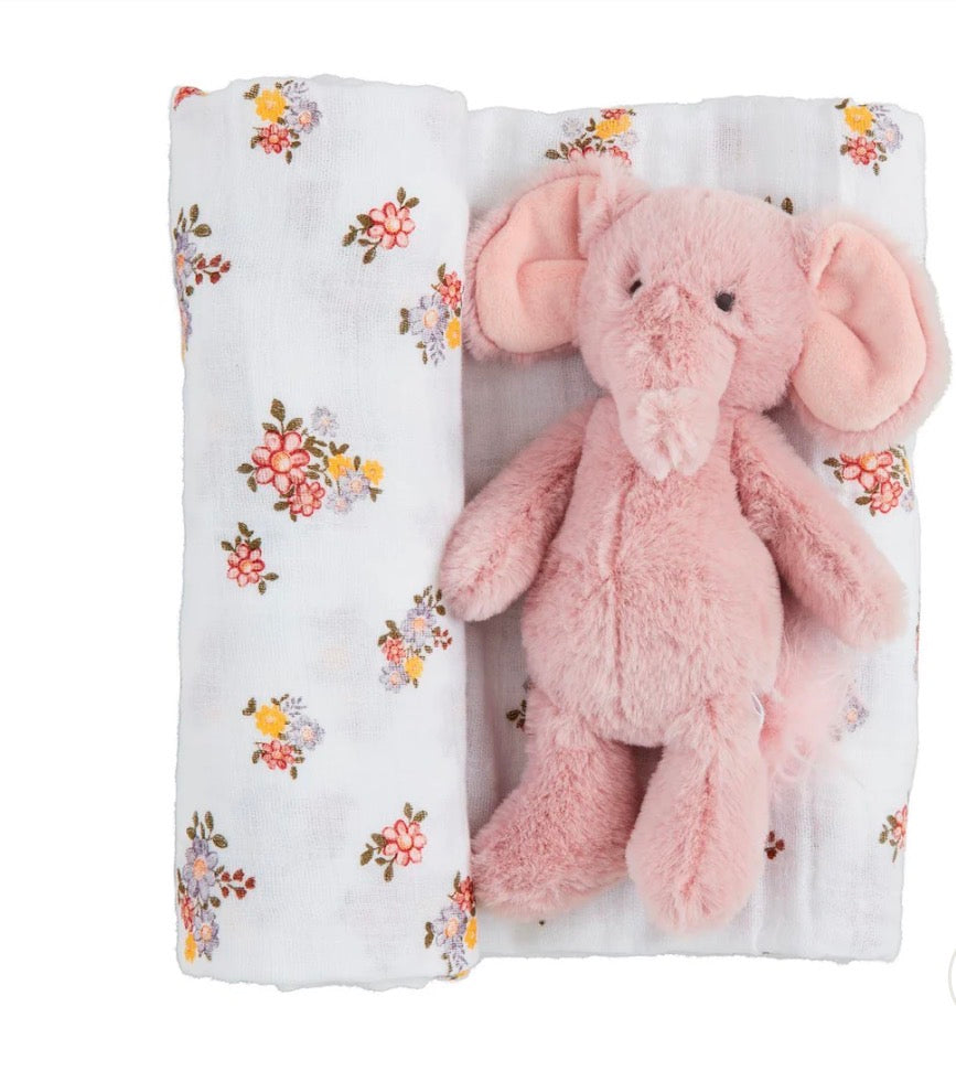 Welcome baby with gentle comfort using the Floral Swaddle & Rattle Set, a sweet 2-piece baby gift perfect for new parents. This charming set includes a 100% cotton muslin swaddle blanket (47" x 47") that’s soft, breathable, and generously sized for cozy, secure swaddling. Paired with an adorable plush mini elephant rattle made from polyester faux fur, this baby swaddle set blends soothing texture and playful sound—making it a thoughtful baby shower gift and a lovely nursery essential.