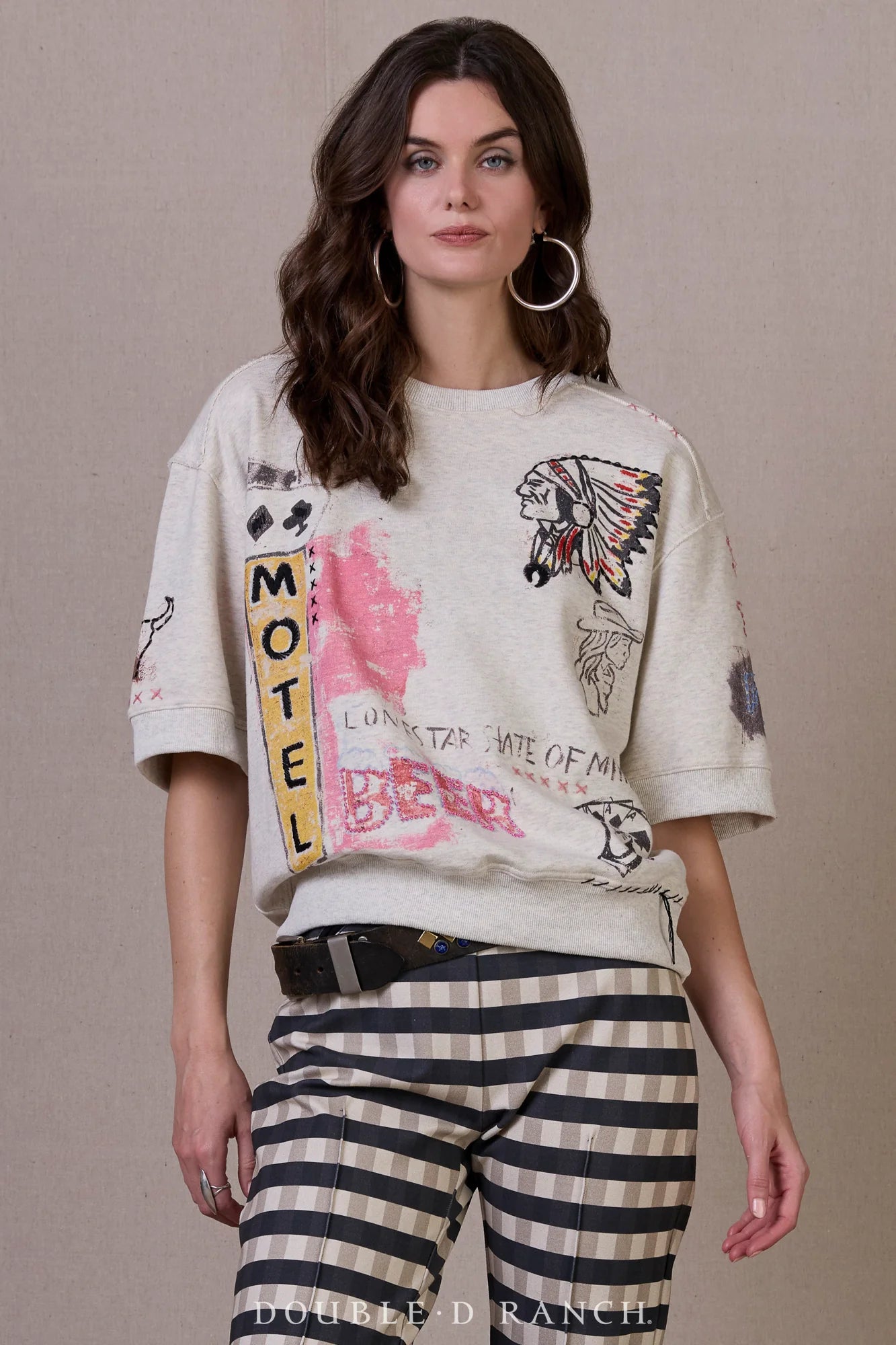 We accidentally sneak-peeked this top in a social media video about something else, and our phones lit up immediately – sold the one right off the model! This is an irresistible must-have from Cowboy Graffiti. Crafted in 100% cotton, it feels just like your favorite sweatshirt, but it’s embellished with all the essence of the collection and colorful artwork elements from our creative collaboration with Ryan Buenning. Plus, it’s short-sleeved, so you can rock it year-round!